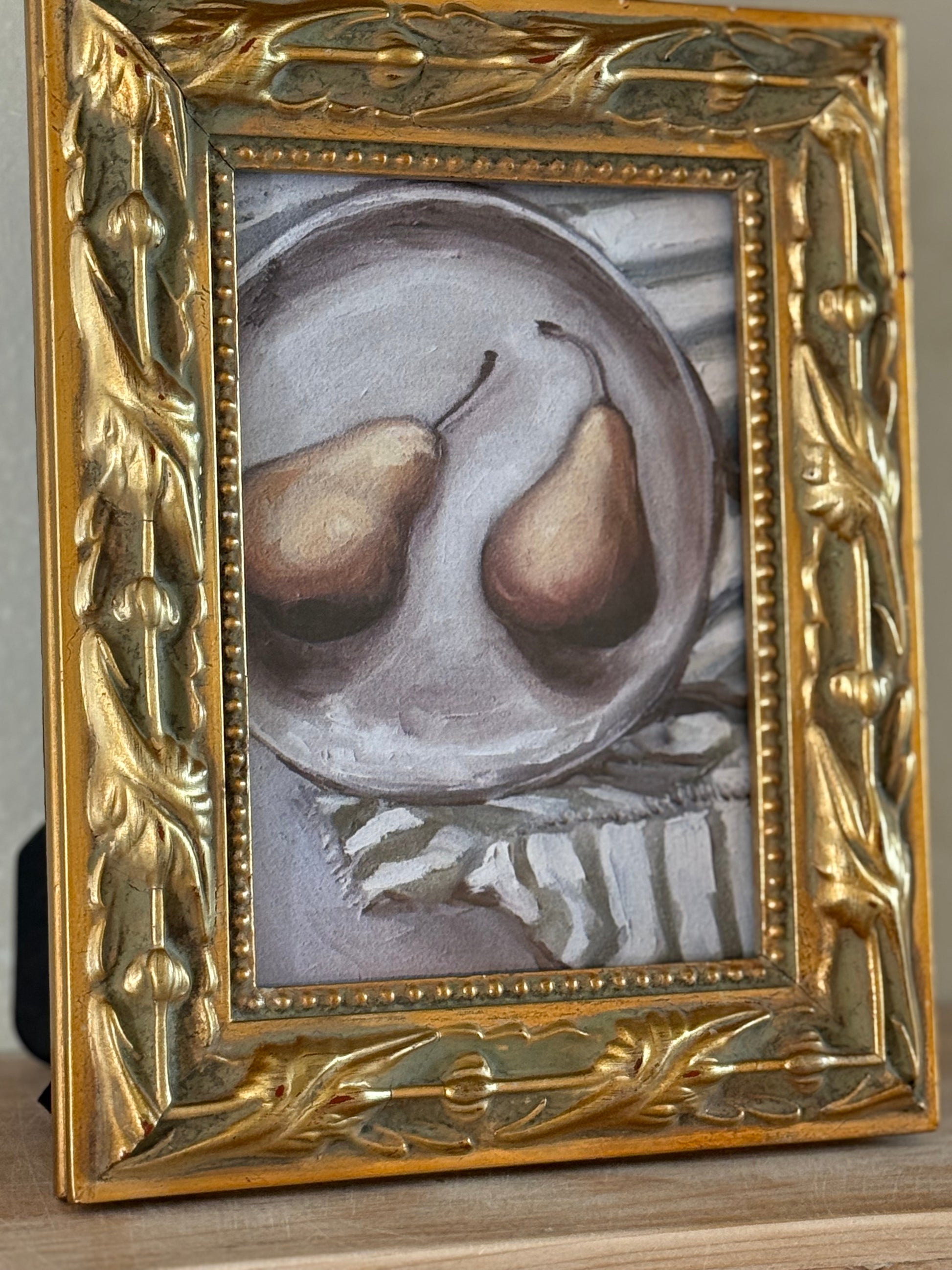 This green and gold ornate frame perfectly fits a 5x7 photo and includes a charming print of a pear painting by an unknown artist. It adds a touch of vintage elegance and color to any room.