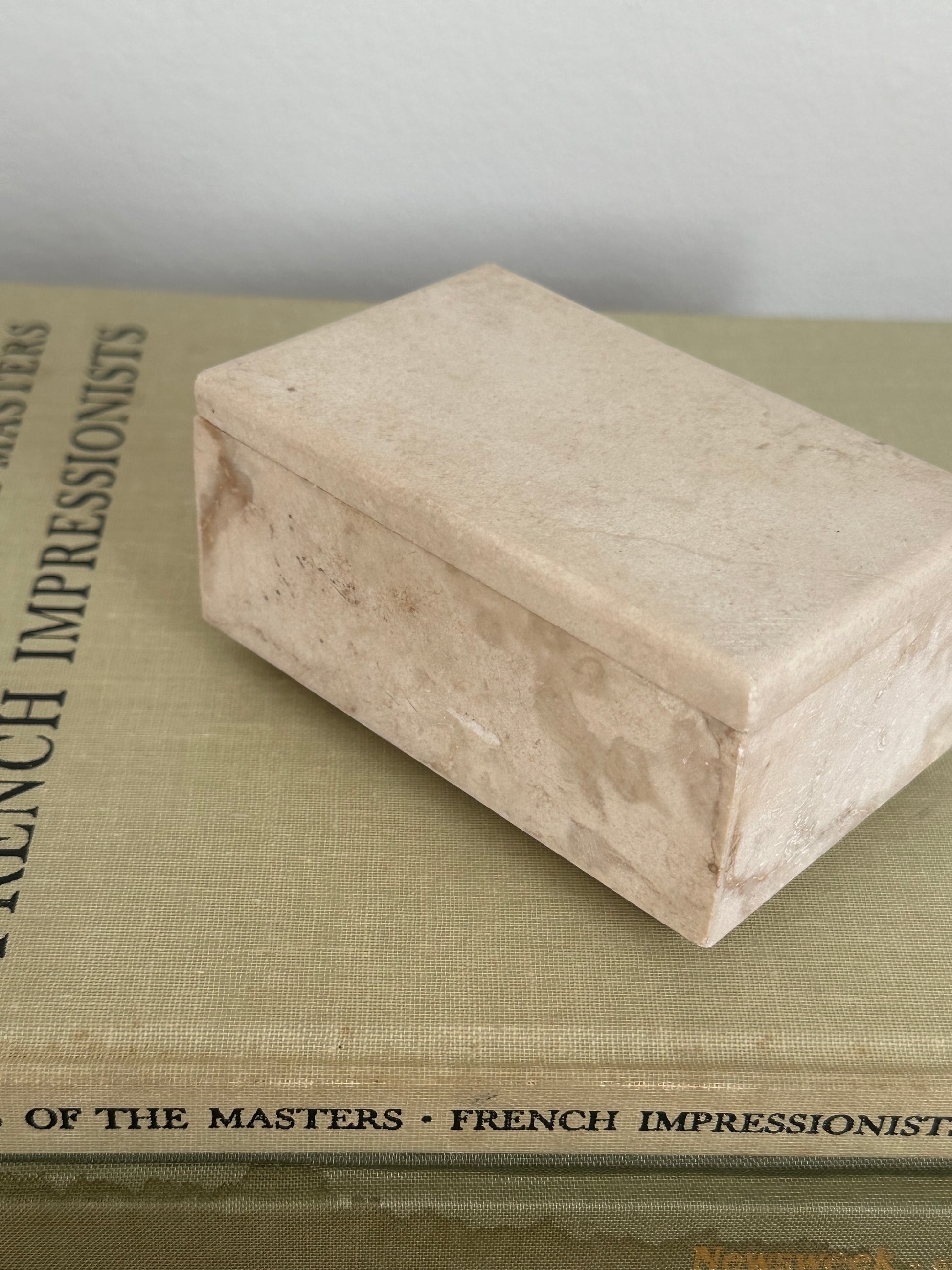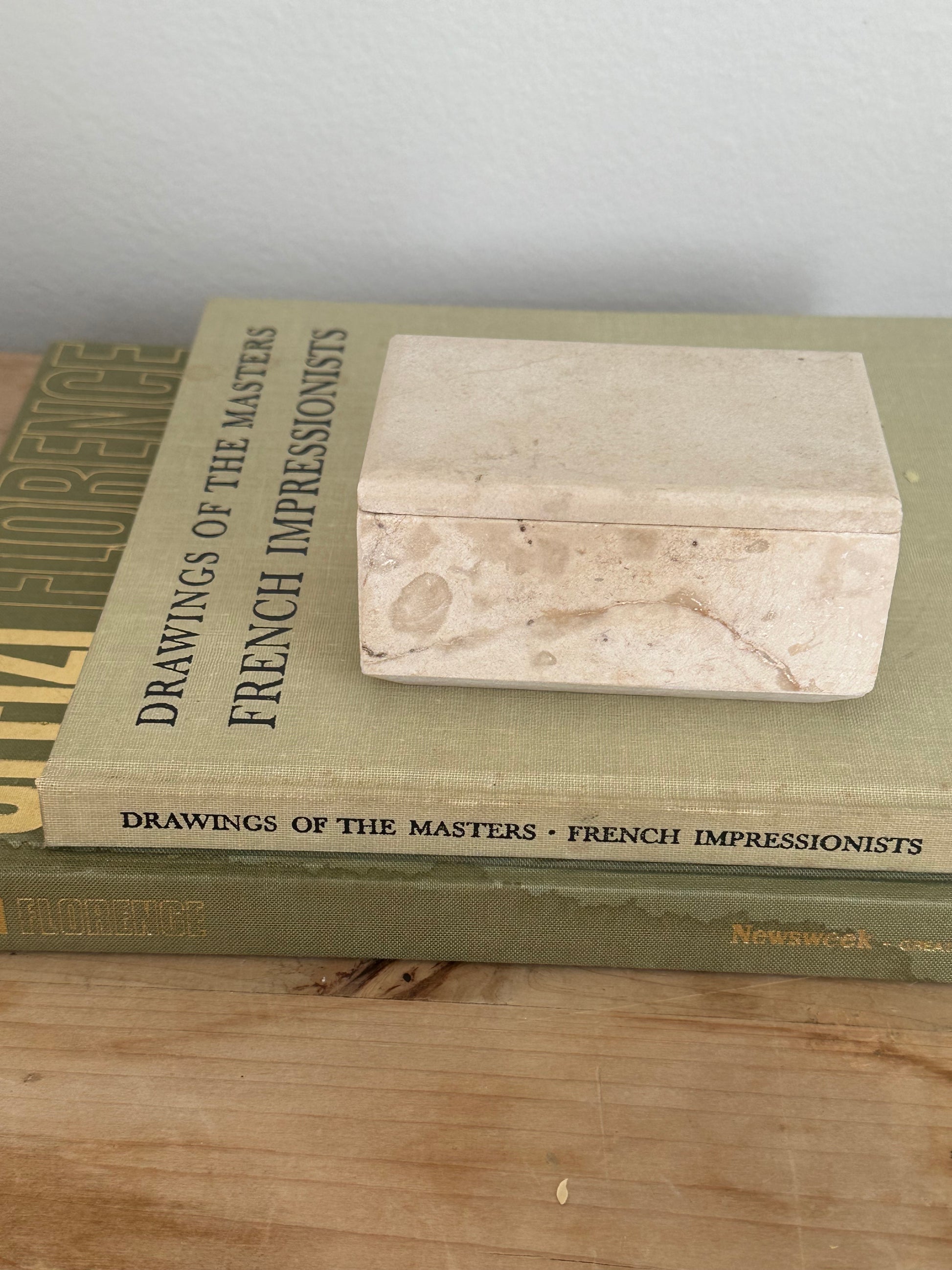 Crafted from beautiful travertine stone, this small box is the perfect accessory for storing your jewelry. The natural stone not only adds a touch of elegance, but also provides durability for long-lasting use. In great condition. 2.5"x4"