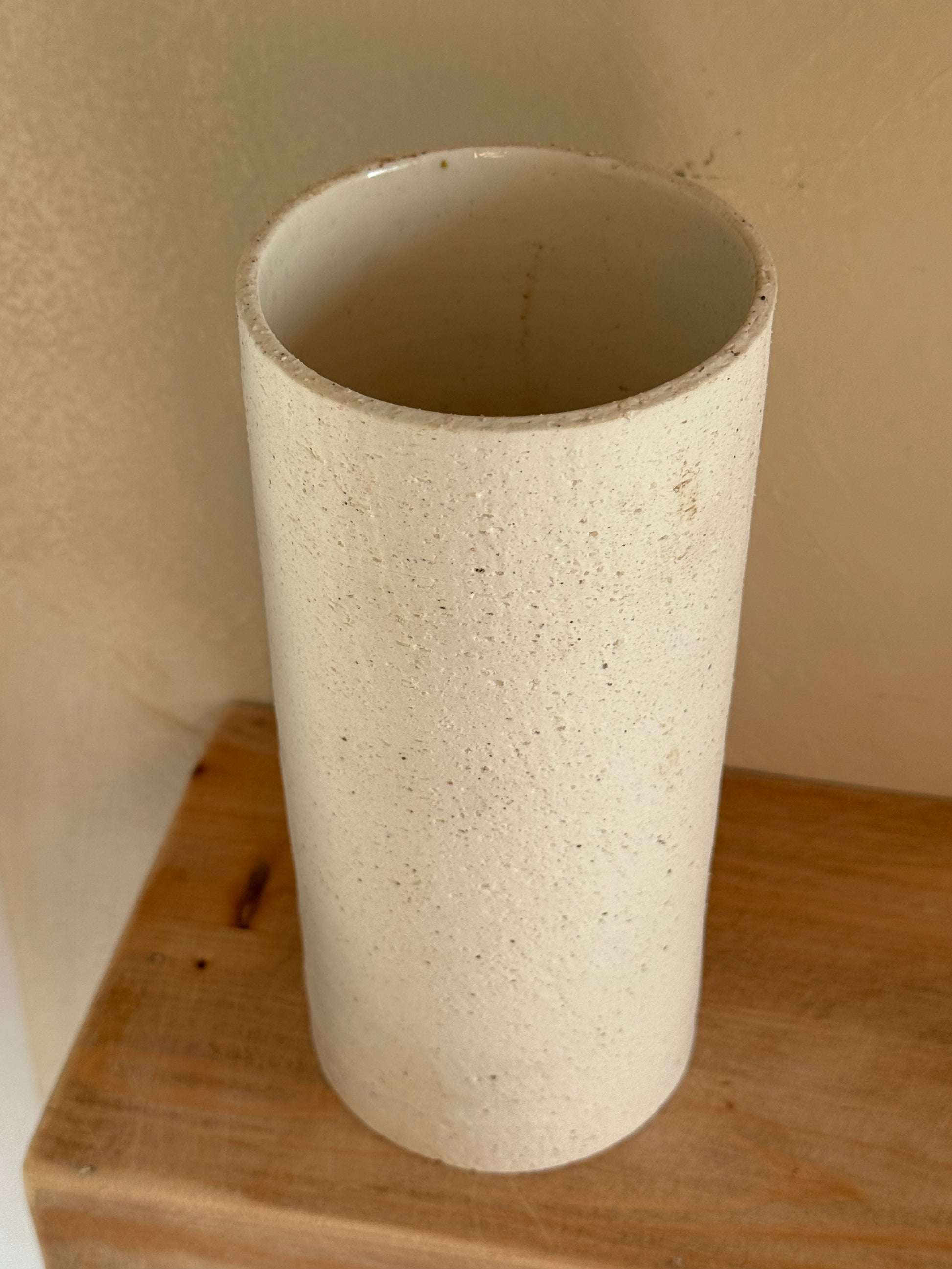 This textured white vessel features a sleek cylindrical shape, offering a minimalist yet tactile design that complements any decor style. 3.5"x7.5"